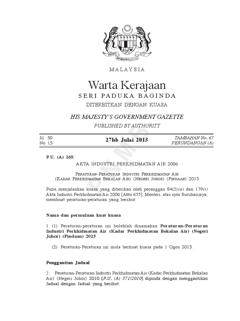 Water Services Industry Rates For Water Supply Services State Of Johor Amendment Regulations 2015
