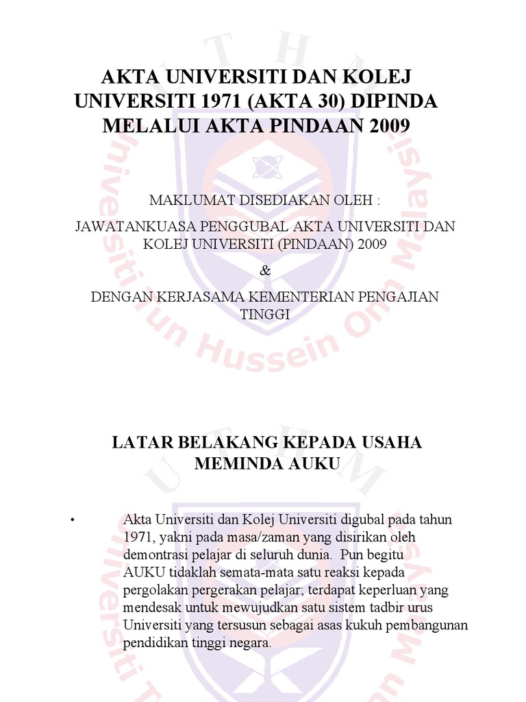 Akta ini bolehlah dinamakan akta universiti dan kolej universiti 1971. Seluruh malaysia 30 april 1971 maka inilah diperbuat undang undang oleh seri paduka baginda yang di pertuan agong dengan nasihat dan. Universiti dan kolej universiti pindaan 1 d r. Iklan dan kemasukan 3 3.