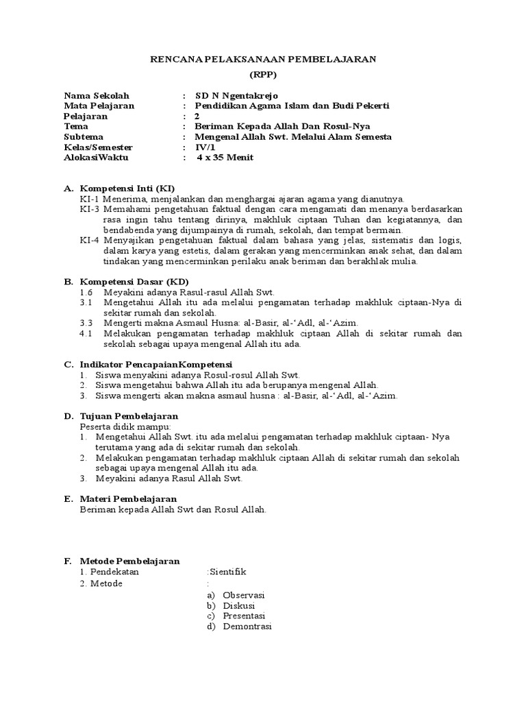 Rpp Bab 2 Iman Kepada Allah Dan Asmaul Husna Kurikulum 2013